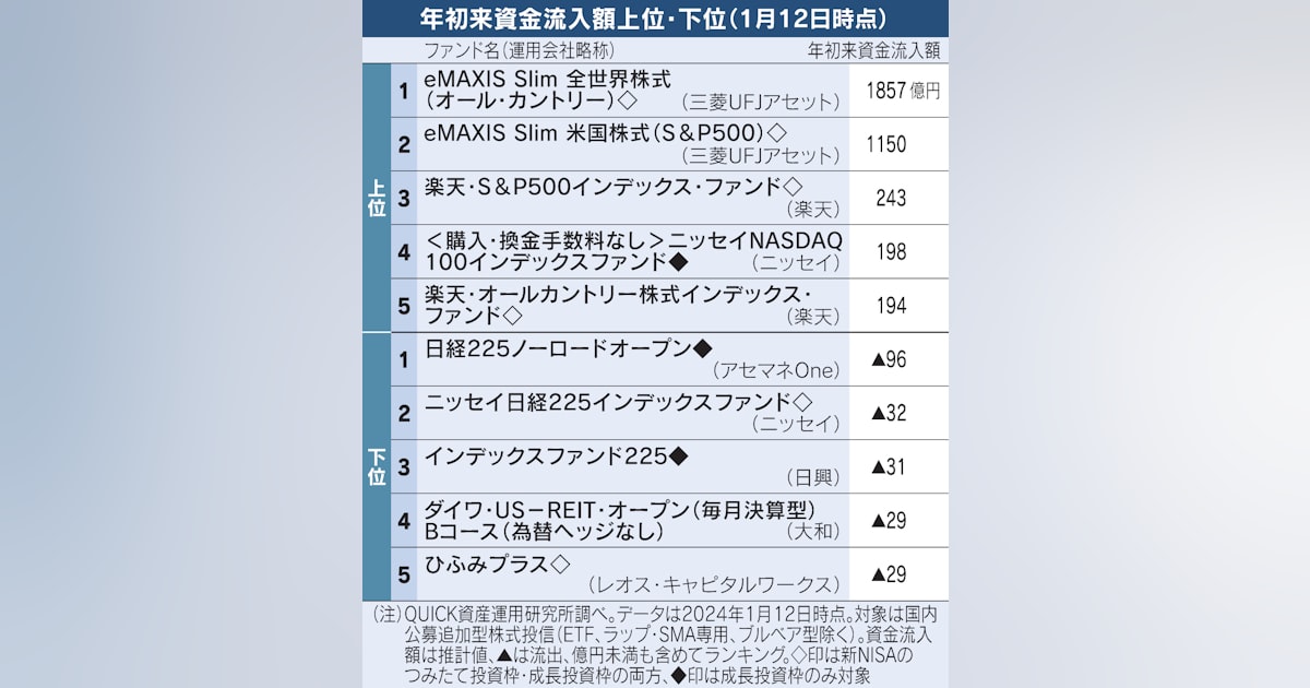 新しい少額投資非課税制度(NISA)が始まった。年明けから日経平均株価が急上昇したなか、どんな投資信託が人気を集めているかを調べた。1月4日から12日までの資金流入額(推計値)の首位は、三菱UFJアセットマネジメントの「eMAXIS Sli...